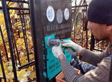 С помощью переносного пескоструйного аппарата мы нанесли на надгробье новые гравировки.